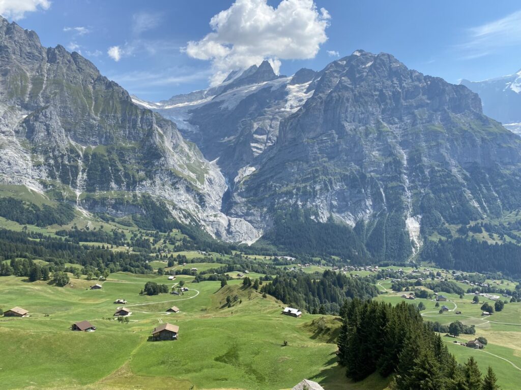 Lunch is served at a mountain restaurant overlooking the Grindelwald valley. With the Eiger rising dramatically nearby, the setting feels unmistakably alpine.