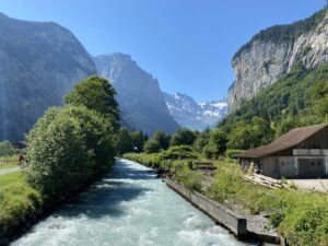 Your guide meets you in Interlaken before travelling into the Lauterbrunnen Valley, often described as one of the most fairytale-like valleys in the Alps. Towering cliffs frame the village, while waterfalls cascade down the rock faces above. A relaxed walk through the village allows time for family photos beside Staubbach Falls – Switzerland’s second-highest waterfall.