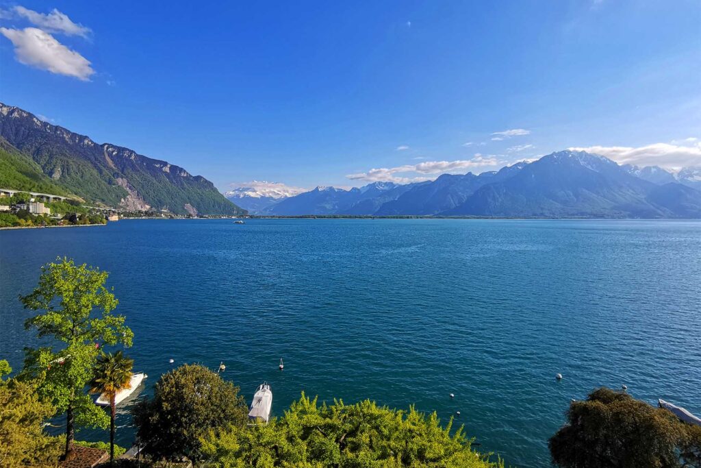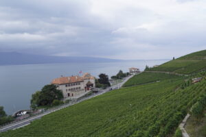 As you get further from Geneva, vineyards begin to appear on steep hillsides. Once you approach Lausanne, the lake opens wide beneath the Alps.